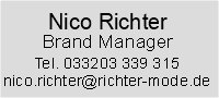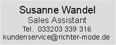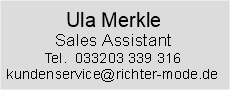 Wenn Sie einen Ordertermin vereinbaren möchten, kontaktieren Sie uns gern per E-Mail unter kundenservice@richter-mode.de oder rufen Sie uns an unter