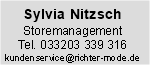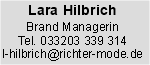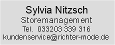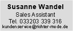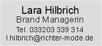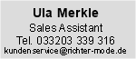 Wenn Sie einen Ordertermin vereinbaren möchten, kontaktieren Sie uns gern per E-Mail unter kundenservice@richter-mode.de oder rufen Sie uns an unter Tel.: 033203 -339 31 0